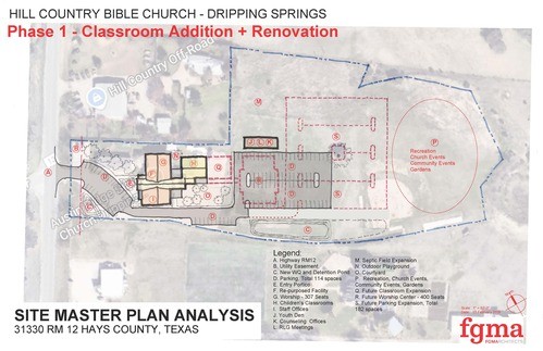 Join us as we approach a new chapter in the life of Hill Country Bible Church. For several years a team has been searching and planning for our next location. We currently rent in a shopping center and this lease is about to expire. This facility has been great for the last 8 years but we now find ourselves limited by location, layout and size. We have now found our new home. It is located at 31330 Ranch Rd 12 on ~6.7 acres with current facilities.